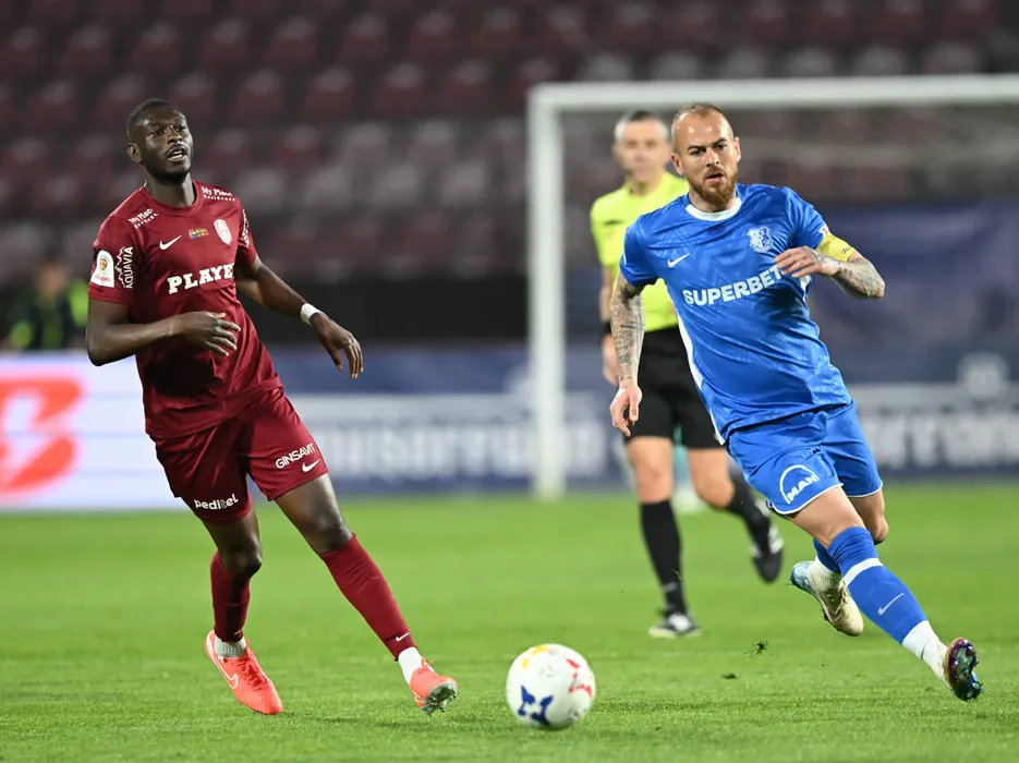 Denis Alibec si Sheriff Sinyan in meciul de fotbal dintre FC CFR 1907 Cluj si FC Farul Constanta, contand pentru Semifinala Cupei Romaniei Betano, desfasurat pe Stadionul Dr.Constantin Radulescu din Cluj-Napoca, joi 24 aprilie 2025. © FOTO: Flaviu Buboi/SPORT PICTURES