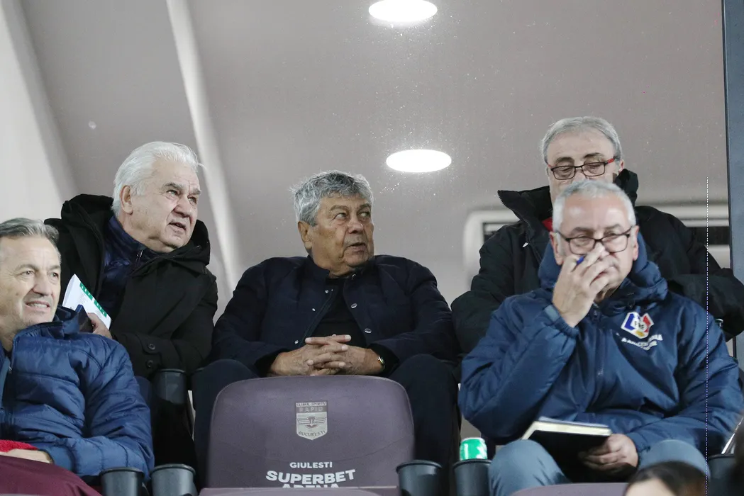 Anghel Iordanescu (S), Mircea Lucescu (C) si Mihai Stoichita (D) urmaresc meciul de fotbal dintre Rapid si Farul Constanta, din etapa a XII-a a Superligii, disputat pe stadionul Rapid-Giulesti din Bucuresti, duminica, 4 octombrie 2025. MIHAI POP / GMN / MEDIAFAX FOTO