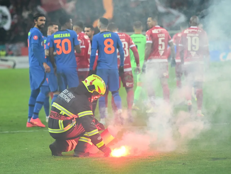 Un pompier aduna tortele de pe teren la meciul de fotbal dintre Dinamo Bucuresti si FCSB, din cadrul Superligii Superbet, desfasurat pe Arena Nationala din Bucuresti, duminica 26 noiembrie 2023. © FOTO:Razvan Pasarica/SPORT PICTURES