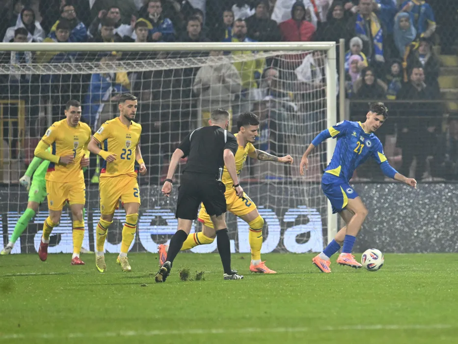 Vlad Dragomir, Dennis Man si Kerim Alajbegović in meciul de fotbal dintre Bosnia Hertegovina si Romania, din cadrul Preliminariilor Campionatului Mondial 2026, desfasurat pe Stadionul Bilino Polje din Zilina, sambata 15 noiembrie 2025. © FOTO:Razvan Pasarica/SPORT PICTURES