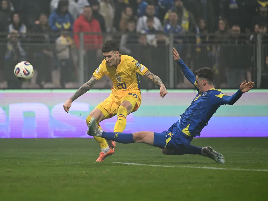 Dennis Man si Benjamin Tahirović in meciul de fotbal dintre Bosnia Hertegovina si Romania, din cadrul Preliminariilor Campionatului Mondial 2026, desfasurat pe Stadionul Bilino Polje din Zilina, sambata 15 noiembrie 2025. © FOTO:Razvan Pasarica/SPORT PICTURES