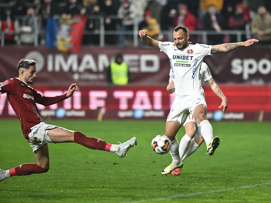 Albion Rrahmani marcheaza un gol de langa Florin Bejan in meciul de fotbal dintre Rapid Bucuresti si FC Hermanstadt, din cadrul Superligii Superbet, desfasurat pe Superbet Arena-Giulesti din Bucuresti, vineri 16 februarie 2024. © FOTO:Razvan Pasarica/SPORT PICTURES