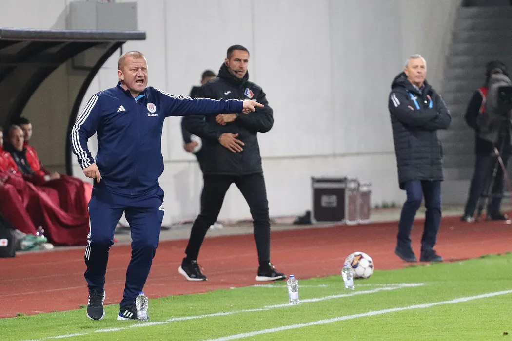 Dorinel Ionel Munteanu dând indicații în meciul de fotbal dintre AFC UTA ARAD si ACS SUPORTER CLUB OTELUL GALATI, contând pentru SUPERLIGA SUPERBET, desfășurat pe Stadionul Municipal din Sibiu, luni 13 noiembrie 2023. © FOTO: Valentin MACREA/SPORT PICTURES