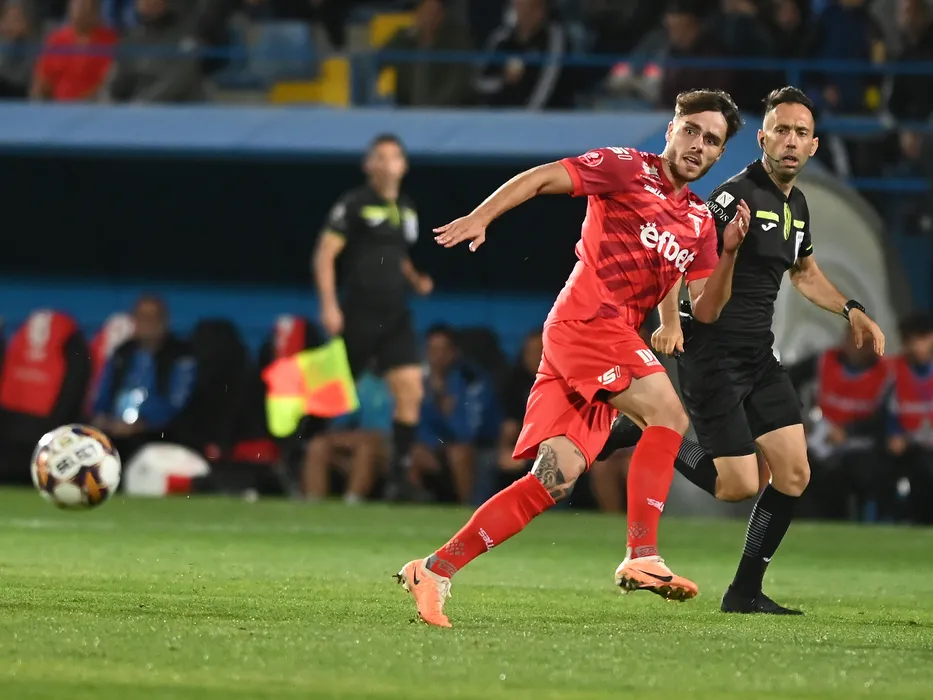 Arbitrul central George Catalin Gaman alaturi de Andrej Fabry in meciul de fotbal dintre Farul Constanta si UTA Arad, contand pentru Superliga Superbet, desfasurat pe Stadionul central al Academiei Gheorghe Hagi din Ovidiu, joi 26 octombrie 2023. © FOTO:Razvan Pasarica/SPORT PICTURES