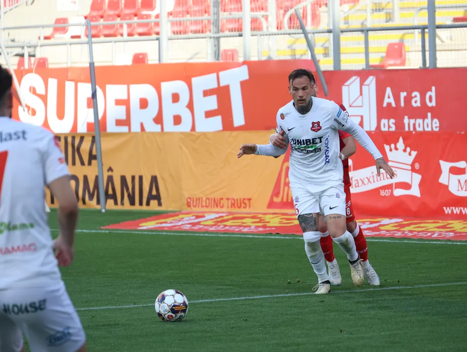 Alesssandro Murgia în meciul de fotbal dintre UTA Arad si AFC Hermannstadt Sibiu, contând pentru Superliga Superbet Play-Out, desfășurat pe Arena Francisc Neuman din Arad, vineri 12 aprilie 2024. © FOTO: Ciprian PETCUȚ/SPORT PICTURES