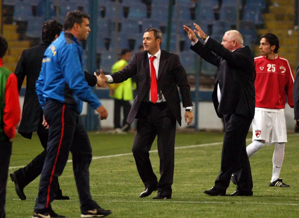 Managerul general al Stelei Mihai Stoica,mascat de antrenorul Cosmin Olaroiu,il felicita la final pe antrenorul dinamovist Mircea Rednic.