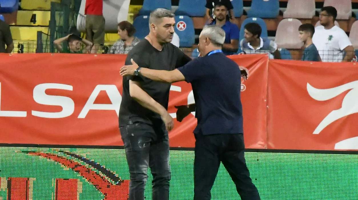 Cei doi antrenori Liviu Ciobotariu și Mircea Rednic se salută după meciul de fotbal dintre FC Botoșani și UTA Arad, contând pentru Superliga Superbet, desfășurat pe Stadionul Municipal din Botoșani, sâmbătă 17 august 2024. © FOTO: Tudi/SPORT PICTURES