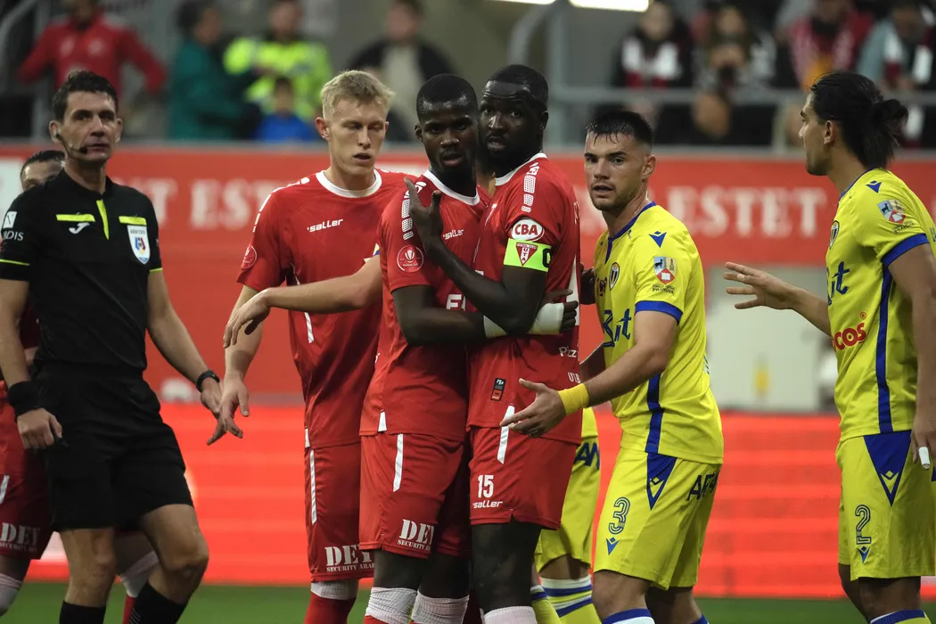 Arbitrul central Horia Gabriel Mladenovici, Ibrahima Sory Conte, Florent Gregoire Paulolo, Denis Lucian Hrezdac și Alexandru Iulian Stănică, Marian Fernando Huja în meciul de fotbal dintre UTA Arad si Petrolul Ploiești, contând pentru Superliga Superbet, desfășurat pe Arena Francisc Neuman din Arad, vineri 4 octombrie 2024. © FOTO: Alexandra FECHETE/SPORT PICTURES