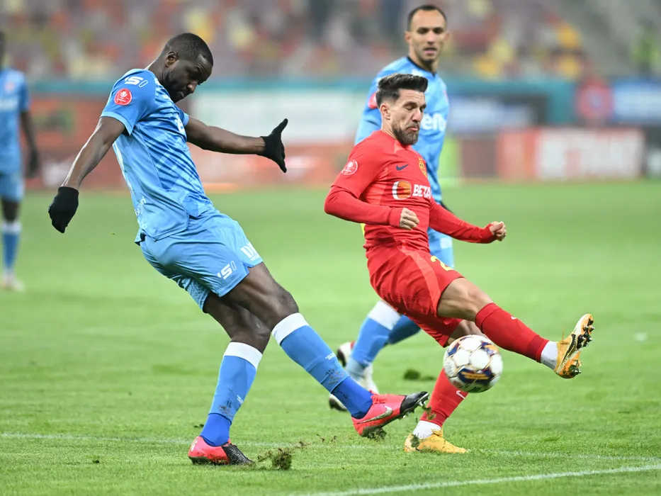 Ibrahima Sory Conte si Alexandru Mihail Baluță în meciul de fotbal dintre FCSB si UTA Arad, contând pentru Superliga Superbet, desfășurat pe Arena Nationala din Bucuresti, luni 22 ianuarie 2024. © FOTO: Răzvan PĂSĂRICĂ/SPORT PICTURES