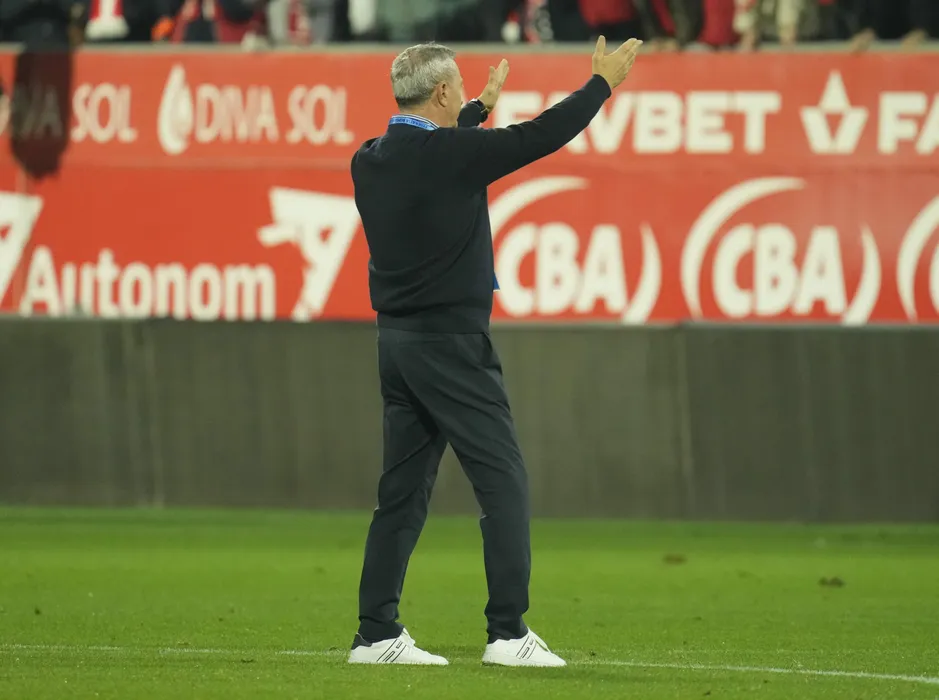 Mircea Rednic salută suporterii după meciul de fotbal dintre UTA Arad si Petrolul Ploiești, contând pentru Superliga Superbet, desfășurat pe Arena Francisc Neuman din Arad, vineri 4 octombrie 2024. © FOTO: Alexandra FECHETE/SPORT PICTURES