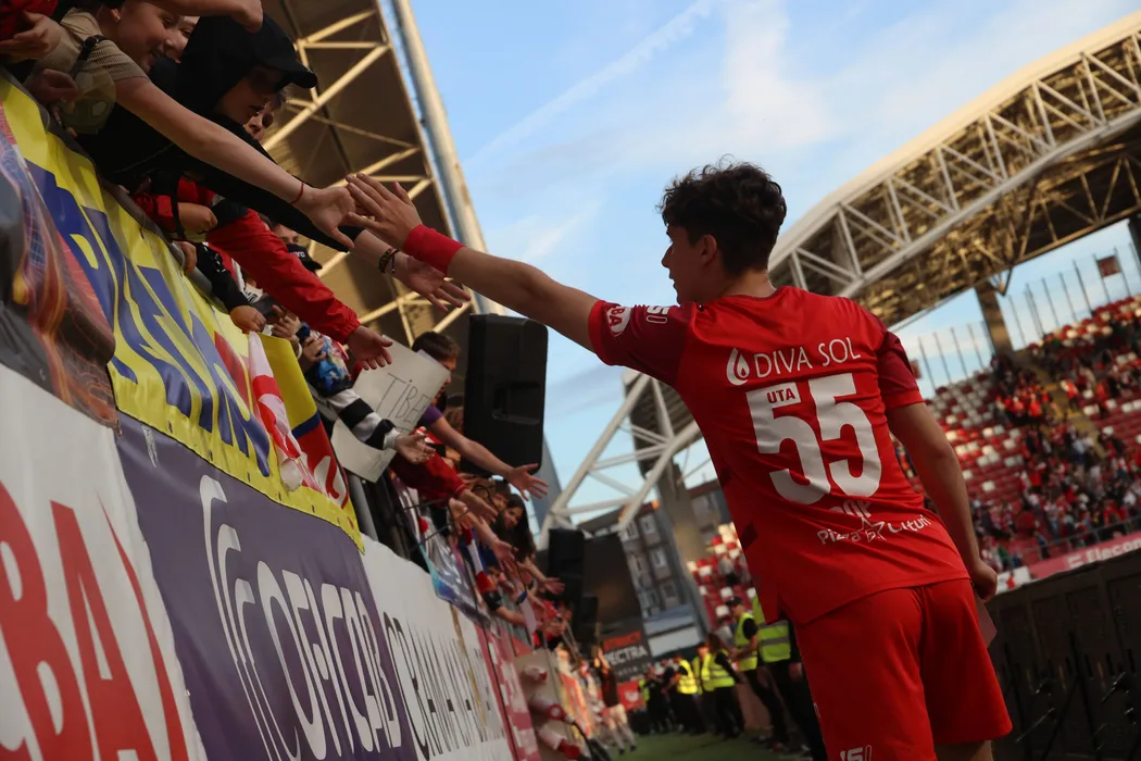Rareș Mihai Pop îi salută pe copii după meciul de fotbal dintre UTA Arad si FC Botoșani, contând pentru Superliga Superbet Play-Out, desfășurat pe Arena Francisc Neuman din Arad, vineri 5 aprilie 2024. © FOTO: Ciprian PETCUȚ/SPORT PICTURES