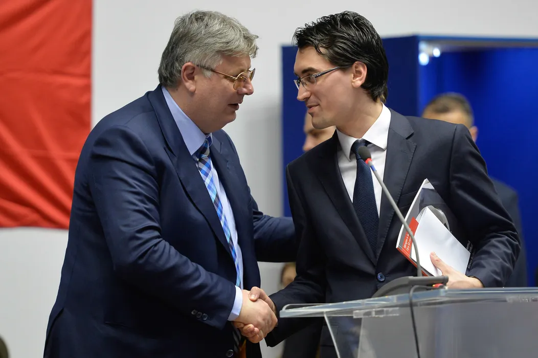 Razvan Burleanu (D) este felicitat de Gino Iorgulescu (S) dupa ce a castigat alegerile pentru presedintia Federatiei Romane de Fotbal in cadrul Adunarii Generale de alegeri a FRF pentru desemnarea noului presedinte al forului, la Casa Fotbalului, in Bucuresti, miercuri, 5 martie 2014. Mircea Sandu va fi presedinte de onoare ale FRF, el fiind votat pentru aceasta functie de membrii FRF, singurul vot împotriva fiind al finantatorului FC Universitatea Craiova, Adrian Mititelu. MARIUS DUMBRAVEANU / MEDIAFAX FOTO