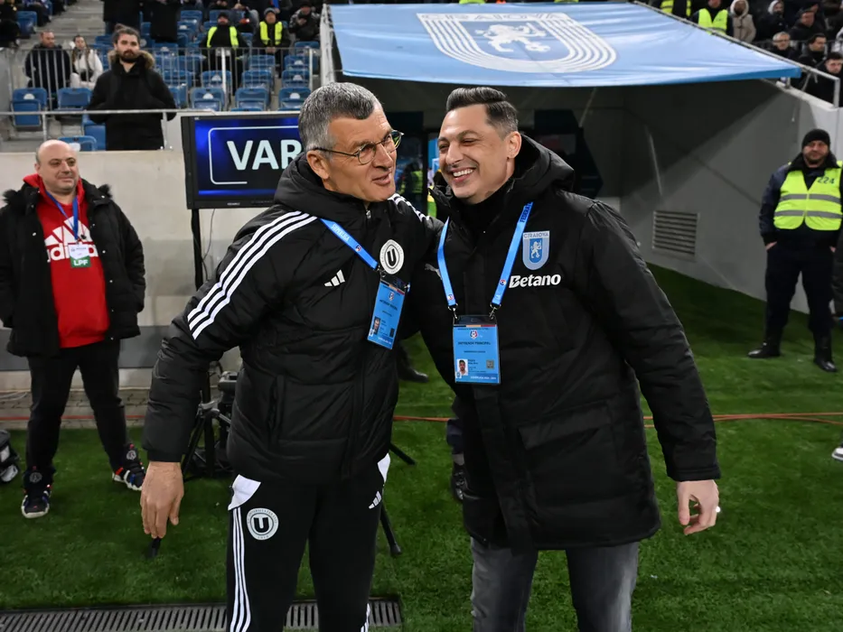 Cei doi antrenori Mirel Matei Radoi și Ovidiu Ioan Sabau se salută înaintea meciului dintre Universitatea Craiova si Universitatea Cluj, contand pentru Superliga Superbet, desfasurat pe Stadionul Ion Oblemenco din Craiova, miercuri 5 februarie 2025. © FOTO:Razvan Pasarica/SPORT PICTURES