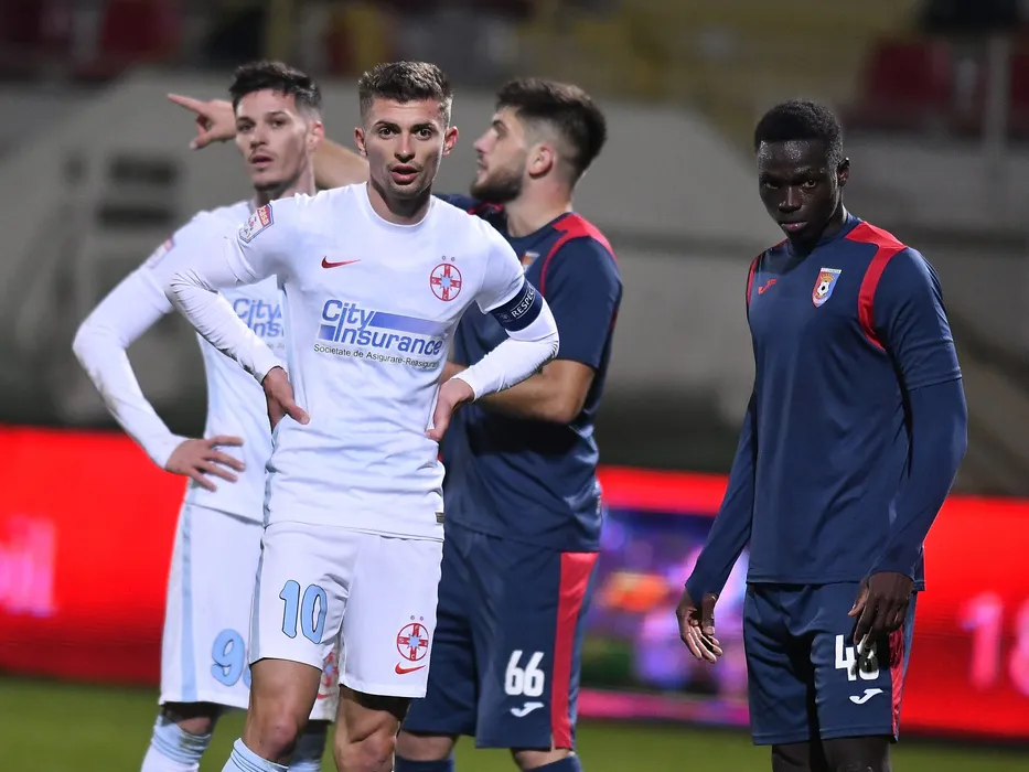 Florin Lucian Tanase si Bourama Fomba in meciul de fotbal dintre Chindia Targoviste si FCSB, contand pentru Liga 1 Casa Pariurilor, desfasurat pe Stadionul Marin Anastasovici din Giurgiu, luni 2 noiembrie 2020. © FOTO:Razvan Pasarica/SPORT PICTURES