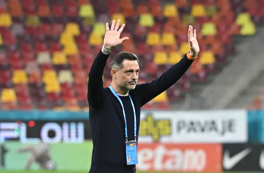 Mirel Matei Radoi saluta galeria ros albastra dupa meciul de fotbal dintre FCSB si UTA Arad, contand pentru Play out-ul Superligii Superbet, desfasurat pe Arena Nationala din Bucuresti, vineri 20 martie 2026. © FOTO:Razvan Pasarica/SPORT PICTURES