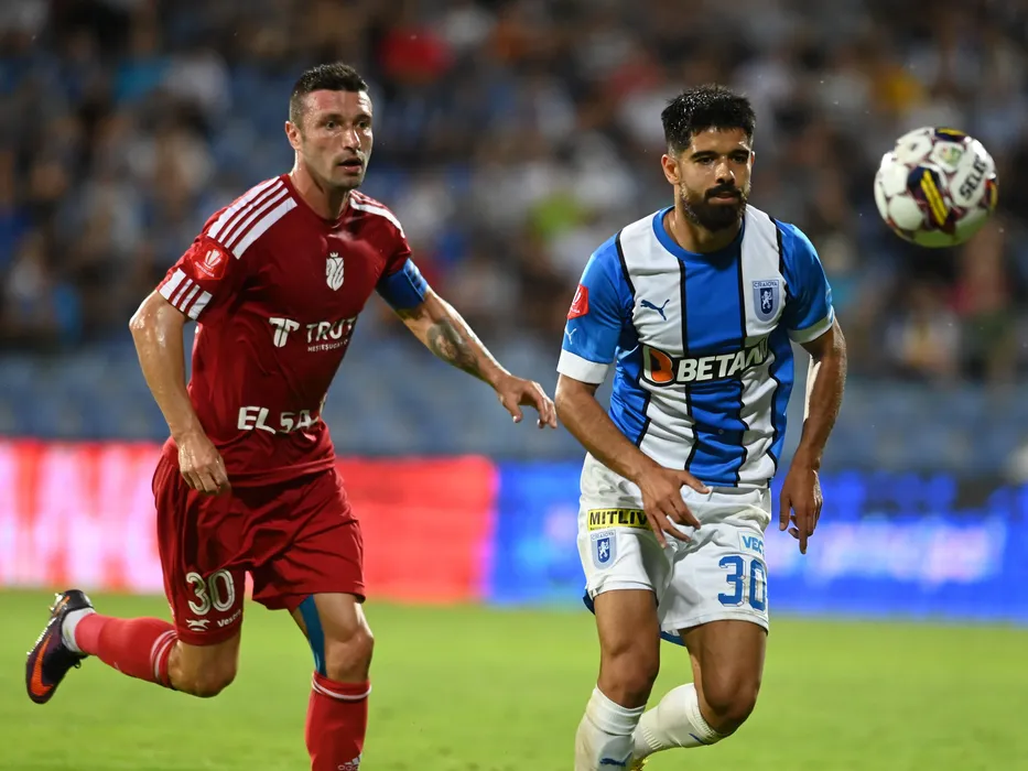 Alexandru Tiganasu si Ionut Daniel Vina in meciul de fotbal dintre Universitatea Craiova si FC Botosani, contand pentru Superliga Superbet, desfasurat pe Stadionul Municipal din Drobeta Turnu Severin, luni 29 august 2022. © FOTO:Razvan Pasarica/SPORT PICTURES