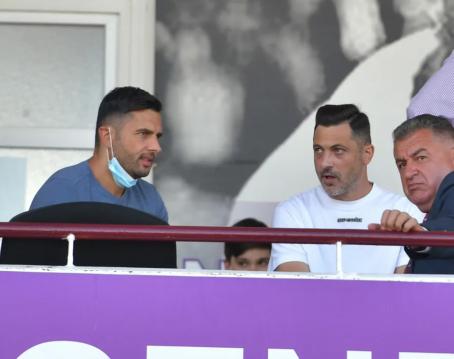 Nicolae Dica si Mirel Radoi asista din tribuna la meciul de fotbal dintre FC Arges si FC U Craiova, contand pentru Liga 1 Casa Pariurilor, desfasurat pe Stadionul Nicolae Dobrin din Pitesti, sambata 11 septembrie 2021. © FOTO:Razvan Pasarica/SPORT PICTURES