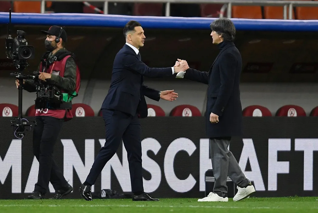 Joachim Low and Mirel Radoi during the game between Romania an Germany, in the World Cup 2022 Qualifiers, at National Arena Bucharest on March 28, 2021 in Bucharest, Romania.