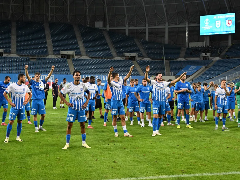 Fotbalistii craioveni Screciu Vladimir Ionuț, Darius Gabriel Falcusan, Stefan Baiaram, Aime Steven Nsasa Nsimba Labe, Assad Al Islam Al Hamlawi, David Matei, Alexandru Cicaldau, Alexandru Cretu si Mihnea Gabriel Radulescu saluta galeria dupa meciul dintre Universitatea Craiova si Universitatea Cluj, contand pentru Superliga Superbet, desfasurat pe Stadionul Ion Oblemenco din Craiova, luni 28 iulie 2025. © FOTO:Razvan Pasarica/SPORT PICTURES