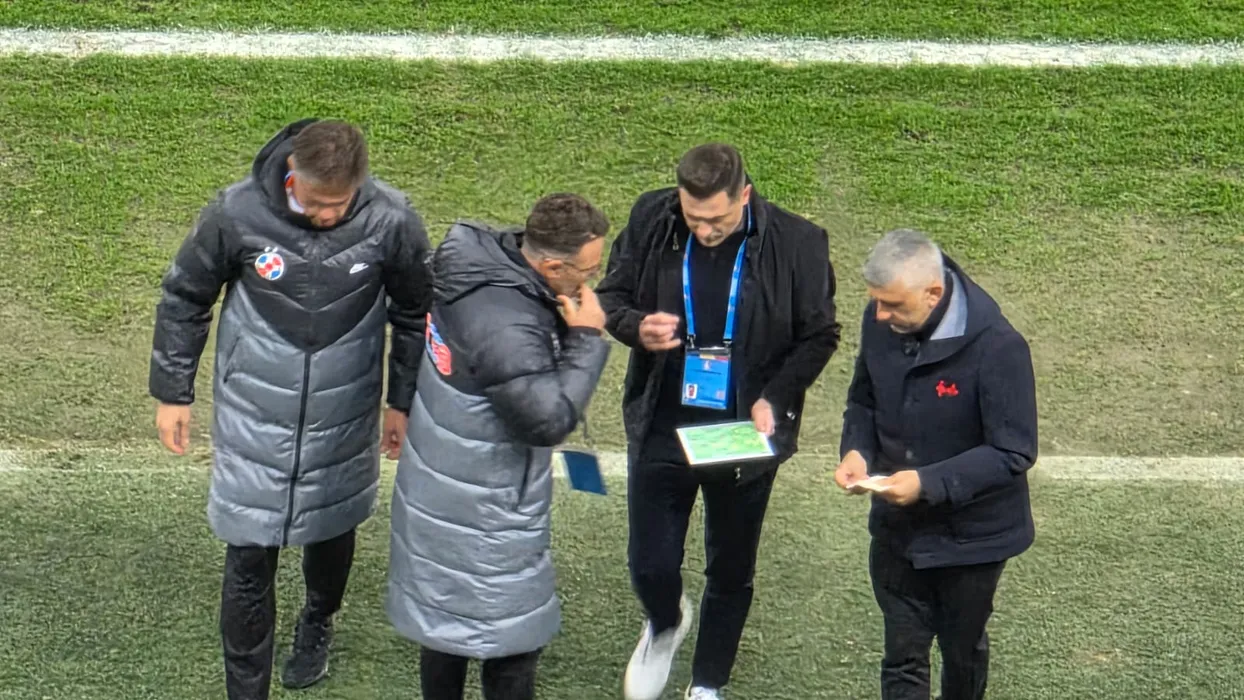 Mirel Rădoi se consultă cu staff-ul său înaintea unei schimbări // Foto ProSport