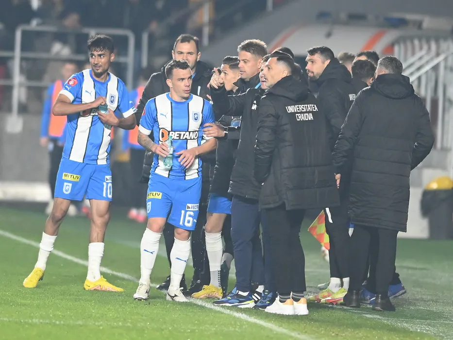 Fotbalistii craioveni Stefan Baiaram, Valerica Marius Gaman si Dan Nicolae Nistor se bucura dupa un gol marcat alaturi de antrenorul lor Mirel Radoi si Mihai Ianovschi in meciul de fotbal dintre Rapid Bucuresti si Universitatea Craiova, contand pentru Superliga Superbet, desfasurat pe Stadionul Rapid Giulesti din Bucuresti, sambata 12 noiembrie 2022. © FOTO:Razvan Pasarica/SPORT PICTURES