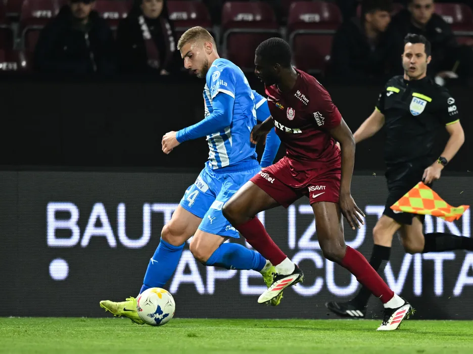 Jovo Lukic si Beni Jean Luc Nkololo in meciul de fotbal dintre FC CFR 1907 Cluj si Universitatea Craiova, contand pentru Cupa Romaniei Betano, desfasurat pe Stadionul Dr.Constantin Radulescu din Cluj-Napoca, joi 3 aprilie 2025. © FOTO: Flaviu Buboi/SPORT PICTURES