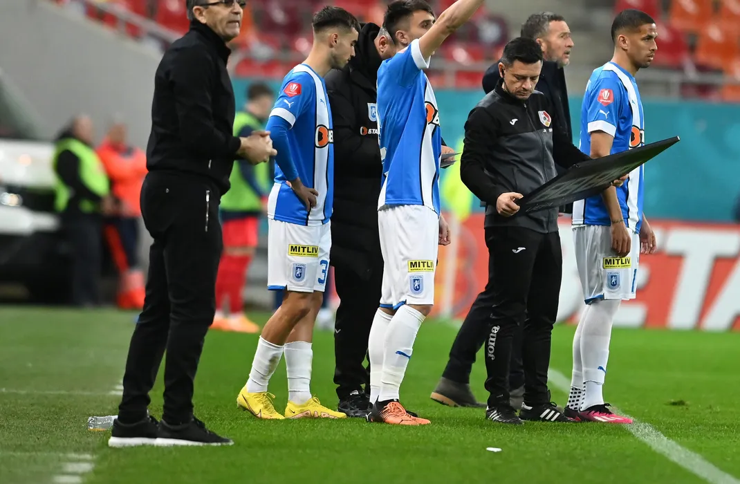 Arbitrul de rezerva Iulian Dima alaturi de fotbalistii craioveni David Sala, Stefan Marinel Vladoiu si Vitor Ferreira Mosac Rivaldo la schimbare la meciul de fotbal dintre FCSB si Universitatea Craiova, contand pentru Superliga Superbet, desfasurat pe Arena Nationala din Bucuresti, duminica 19 februarie 2023. © FOTO:Razvan Pasarica/SPORT PICTURES