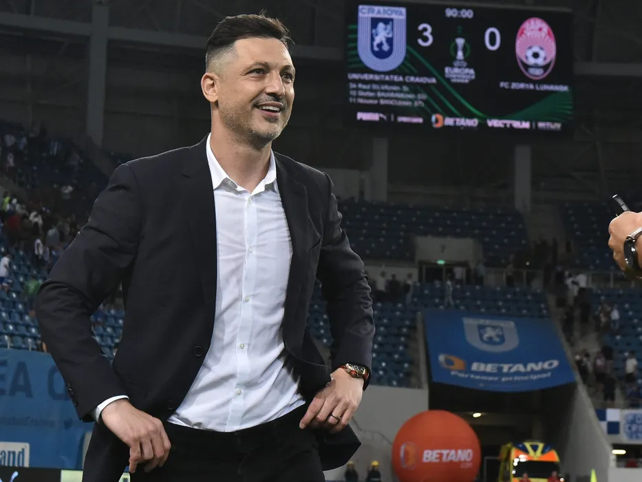 Noul antrenor al Craiovei, Mirel Radoi, se bucura alaturi de tabela de marcaj dupa meciul de fotbal dintre Universitatea Craiova si FC Zorya Luhansk, din cadrul UEFA Europa Conference League, desfasurat pe Stadionul Ion Oblemenco din Craiova, joi 11 august 2022. © FOTO:Razvan Pasarica/SPORT PICTURES