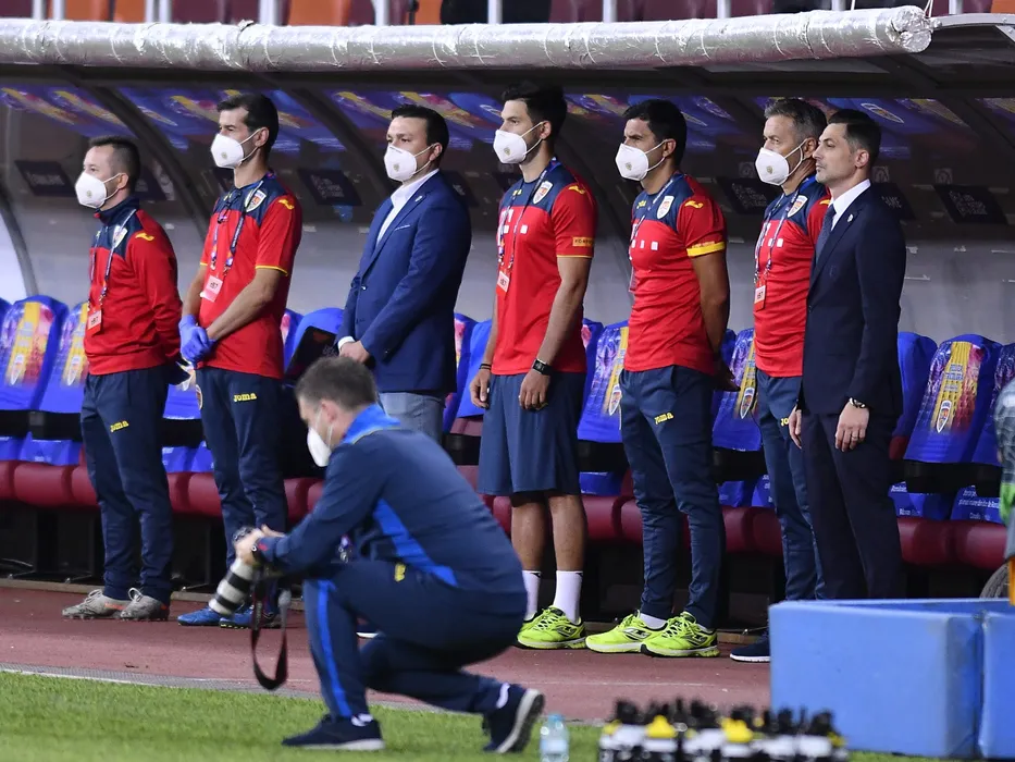 Banca Romaniei cu Nicolae Dica, Florin Constantinovici si Mirel Radoi in meciul de fotbal dintre Romania si Irlanda de Nord, contand pentru Liga Natiunilor, desfasurat fara spectatori pe Arena Nationala din Bucuresti, vineri 4 septembrie 2020. © FOTO:Razvan Pasarica/SPORT PICTURES