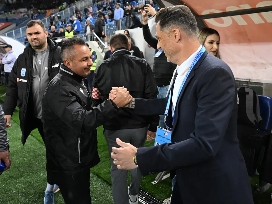 Florentin Petre si Mirel Matei Radoi se saluta inaintea meciului dintre Universitatea Craiova si Dinamo Bucuresti, contand pentru Play off-ul Superligii Superbet, desfasurat pe Stadionul Ion Oblemenco din Craiova, sambata 24 mai 2025. © FOTO:Razvan Pasarica/SPORT PICTURES