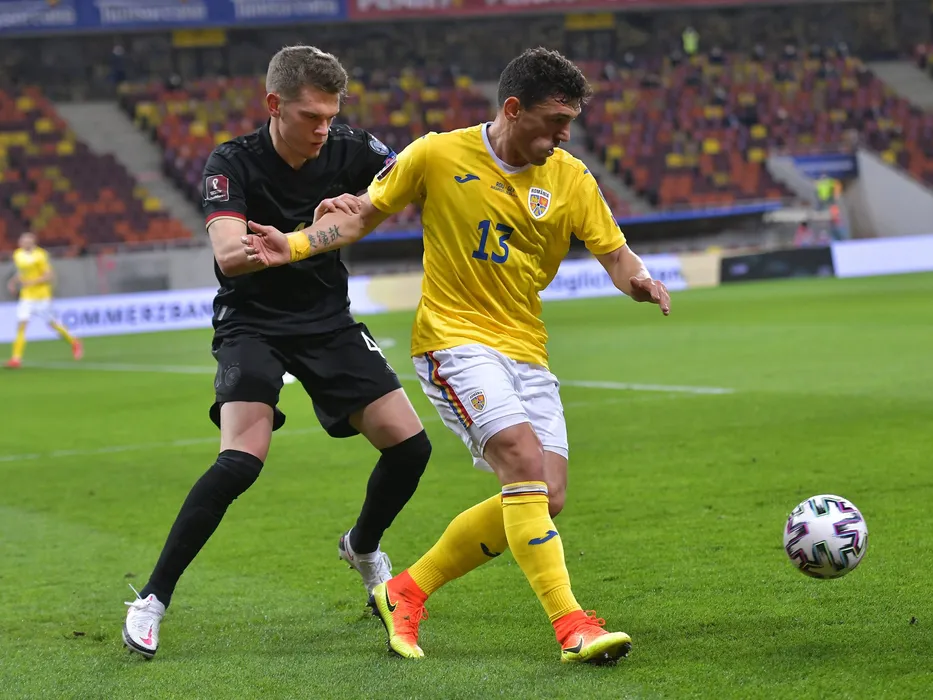 Matthias Ginter si Claudiu Keseru in meciul de fotbal dintre Romania si Germania, din cadrul Preliminariilor Campionatului Mondial 2022, desfasurat fara spectatori pe Arena Nationala din Bucuresti, duminica 28 martie 2021. © FOTO:Razvan Pasarica/SPORT PICTURES