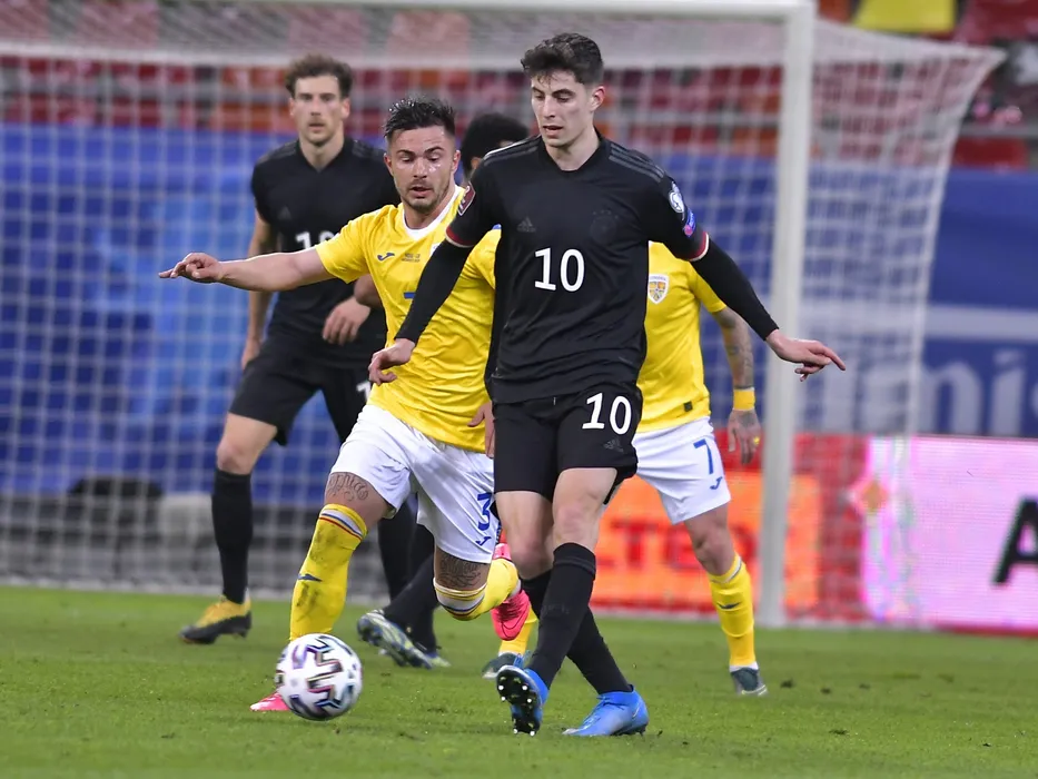 Alin Tosca si Kai Havertz in meciul de fotbal dintre Romania si Germania, din cadrul Preliminariilor Campionatului Mondial 2022, desfasurat fara spectatori pe Arena Nationala din Bucuresti, duminica 28 martie 2021. © FOTO:Razvan Pasarica/SPORT PICTURES