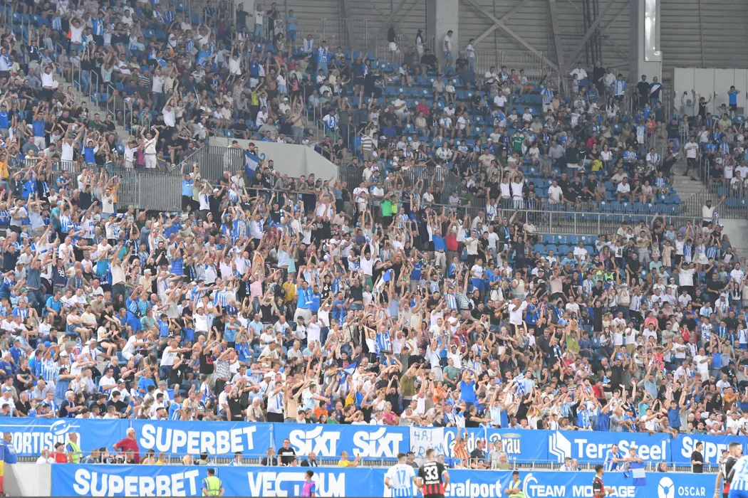 Suporterii craioveni fac valuri in tribuna la meciul de fotbal dintre Universitatea Craiova si Spartak Trnava, contand pentru Turul 3 Preliminar al Conference League, desfasurat pe Stadionul Ion Oblemenco din Craiova, joi 7 august 2025. © FOTO:Remus Badea/SPORT PICTURES