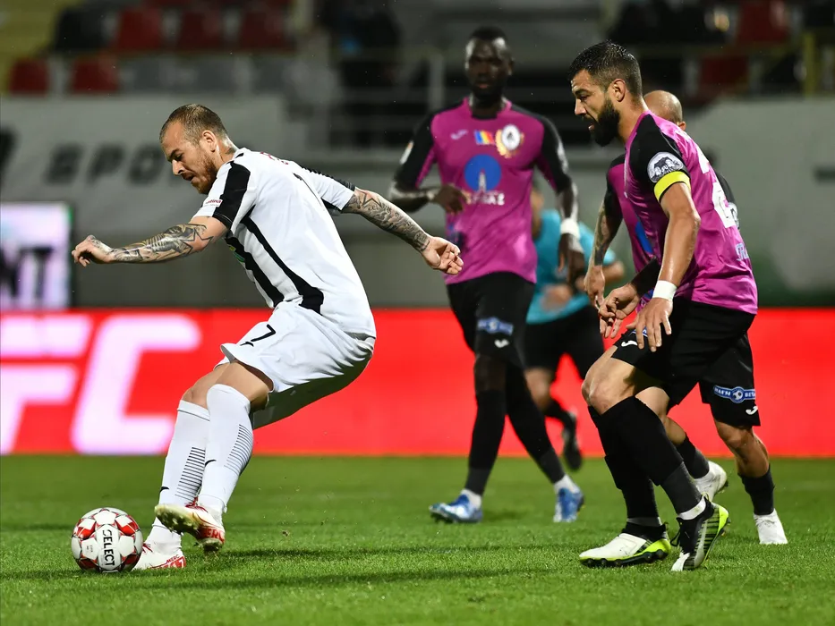 Denis Alibec si Marius Marcel Constantin in meciul de fotbal dintre Astra Giurgiu si Gaz Metan Medias, contand pentru play-off-ul Ligii 1 Casa Pariurilor, disputat fara spectatori pe Stadionul Marin Anastasovici din Giurgiu, luni 15 iunie 2020. © FOTO:Razvan Pasarica/SPORT PICTURES