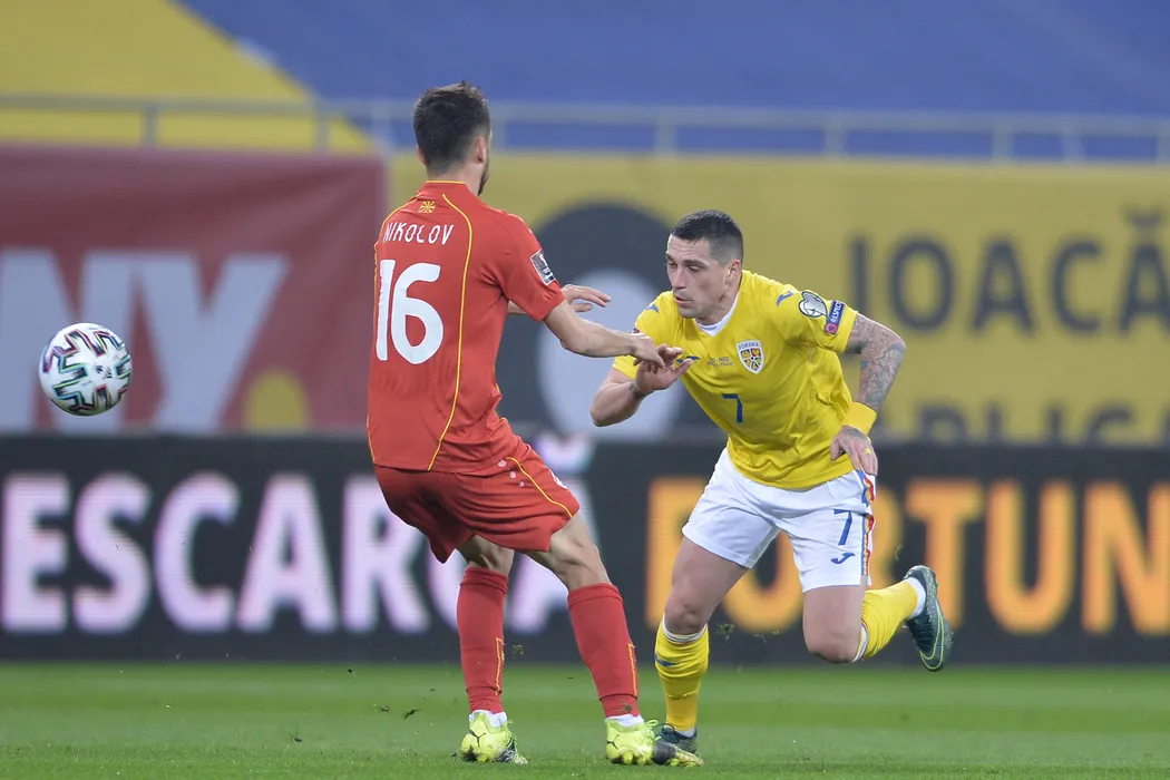 Reprezentativele Romaniei (echipament galben) si Macedoniei de Nord s-au intalnit intr-o partida contand pentru preliminariile CM 2022, joi 25 noiembrie 2021, pe Arena Nationala din Bucuresti. ALEXANDRU DOBRE / MEDIAFAX FOTO