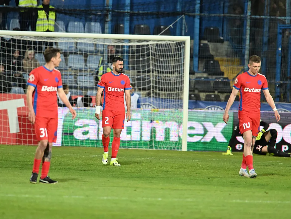 Fotbalistii ros-albastrii Juri Cisotti, Valentin Cretu si Florin Lucian Tănase dezamagiti dupa un gol primit in meciul de fotbal dintre Farul Constanta si FCSB, contand pentru Play out-ul Superligii Superbet, desfasurat pe Stadionul central al Academiei Gheorghe Hagi din Ovidiu, duminica 20 aprilie 2026. © FOTO:Razvan Pasarica/SPORT PICTURES