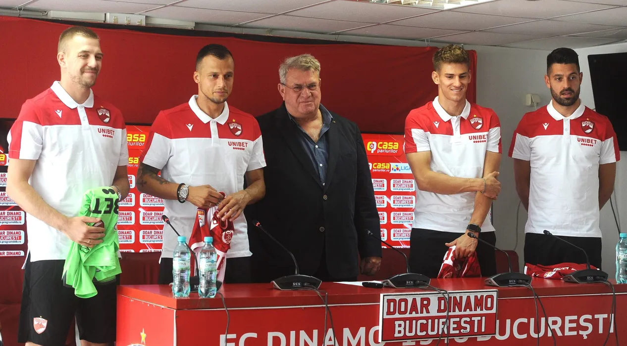 Presedintele clubului de fotbal Dinamo, Iuliu Muresan (C), prezinta jurnalistilor pe cei patru noi jucatori ce se vor alatura echipei si anume Plamen Iliev, Mirko Ivanovski, Catain Itu si Catalin Tirta (de la stanga la dreapta), in timpul unei conferinte de presa desfasurata la sediul clubului din Bucuresti, joi, 9 septembrie 2021. EDUARD VINATORU / MEDIAFAX FOTO