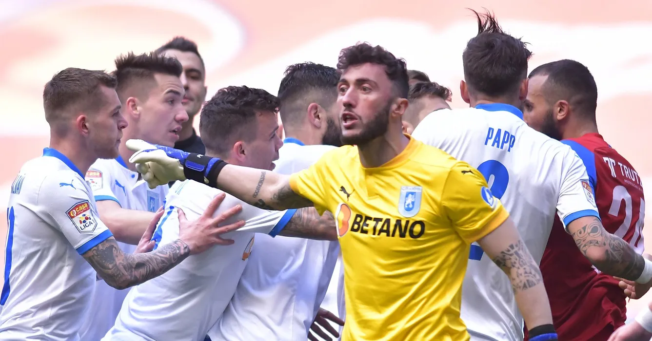Alexandru Cicaldau, Alexandru Mateiu, Dan Nicolae Nistor si Marius Marcel Constantin discuta cu un adversar alaturi de Mirko Pigliacelli in meciul de fotbal dintre Universitatea Craiova si FC Botosani, contand pentru Liga 1 Casa Pariurilor, desfasurat fara spectatori pe Stadionul Ion Oblemenco din Craiova, sambata 6 martie 2021. © FOTO:Razvan Pasarica/SPORT PICTURES
