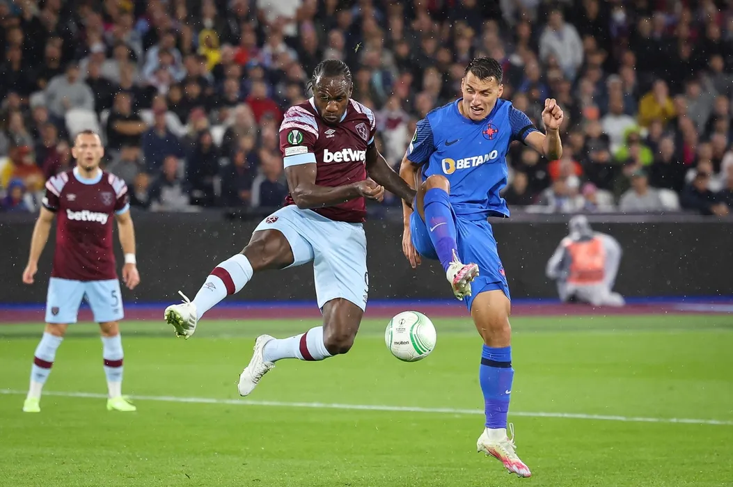 Michail Antonio of West Ham United under pressure from Risto Radunovic of FCSB
