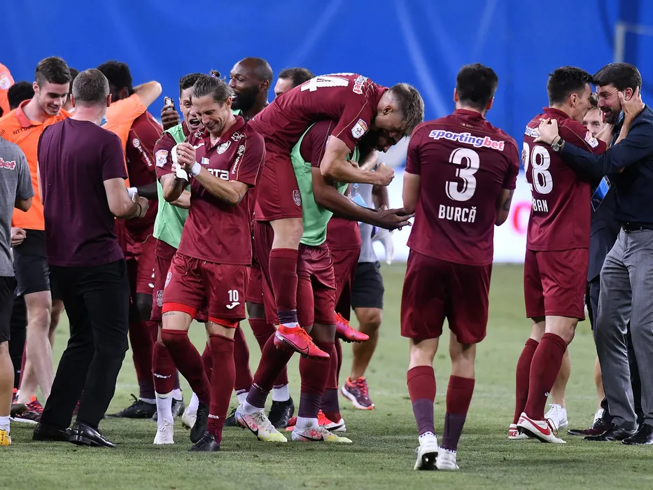 Bucurie a fotbalistilor clujeni Ciprian Deac, Catalin Itu si Ovidiu Hoban alaturi de Marian Copilu dupa castigarea titlului de campioana in urma meciului de fotbal dintre Universitatea Craiova si CFR Cluj, contand pentru play-off-ul Ligii 1 Casa Pariurilor, disputat fara spectatori pe Stadionul Ion Oblemenco din Craiova, luni 3 august 2020. © FOTO:Razvan Pasarica/SPORT PICTURES