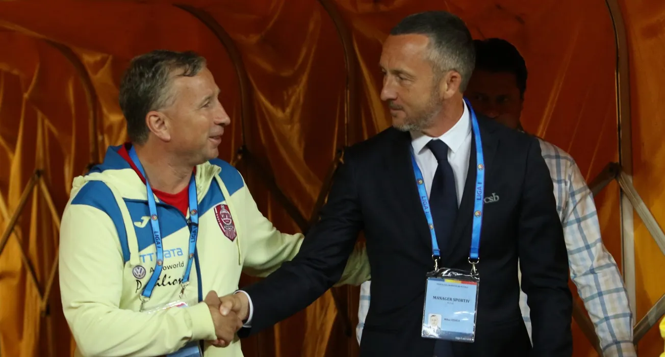 Antrenorul formatiei CFR Cluj, Dan Petrescu (S) si Mihai "Meme" Stoica, directorul sportiv al FCSB, isi strang mainile inaintea partidei dintre cele doua formatii, partida desfasurata in cadrul etapei a 7-a a play-off-ul Ligii I la fotbal, duminica 19 aprilie 2018, pe Arena Nationala din Bucuresti. GEORGE FLUSTER / MEDIAFAX FOTO