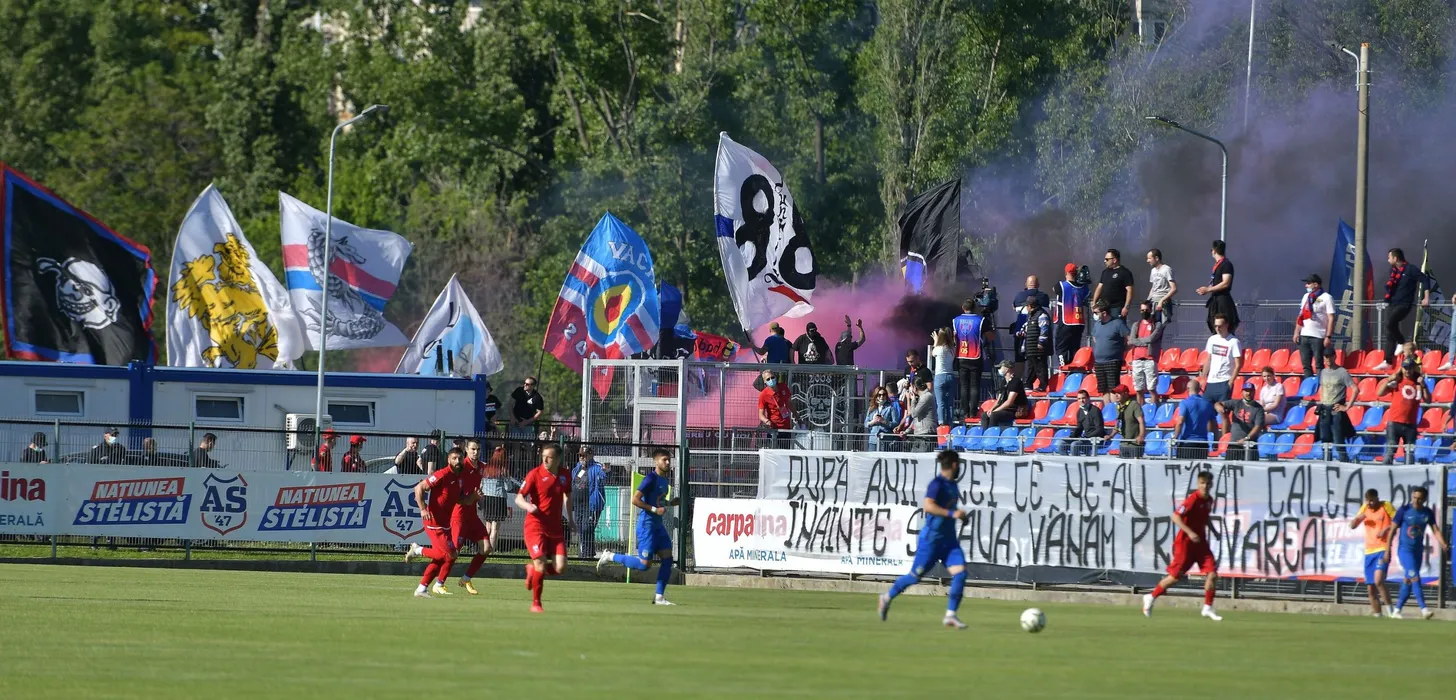 Suporteri in tribuna alaturi de un baner la meciul de fotbal dintre CSA Steaua Bucuresti si CS Afumati, barajul pentru promovarea in Liga a-2-a, desfasurat pe Terenul 5 al Complexului Sportiv Ghencea din Bucuresti, sambata 22 mai 2021. © FOTO:Razvan Pasarica/SPORT PICTURES