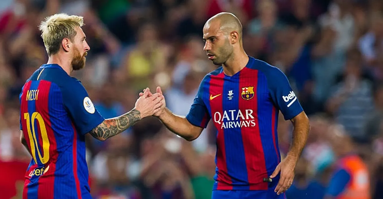 BARCELONA, SPAIN - AUGUST 17: Lionel Messi (L) of FC Barcelona is congratulated by his teammate Javier Mascherano (R) after scoring his team's third goal during the Spanish Super Cup Final second leg match between FC Barcelona and Sevilla FC at Camp Nou on August 17, 2016 in Barcelona, Spain. (Photo by Alex Caparros/Getty Images)