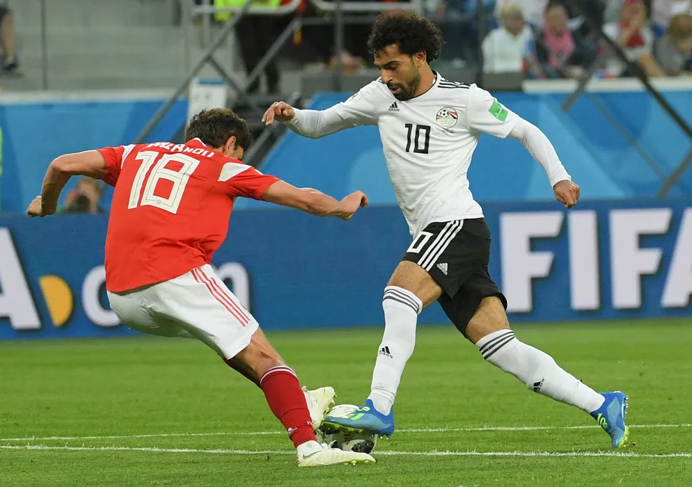 5542839 19.06.2018 Russia's Yuri Zhirkov, left, and Egypt's Mohamed Salah struggle for a ball during the World Cup Group A soccer match between Russia and Egypt at the St. Petersburg Arena in St. Petersburg, Russia, June 19, 2018. Alexei Danichev / Sputnik/ Hepta / Sport Pictures