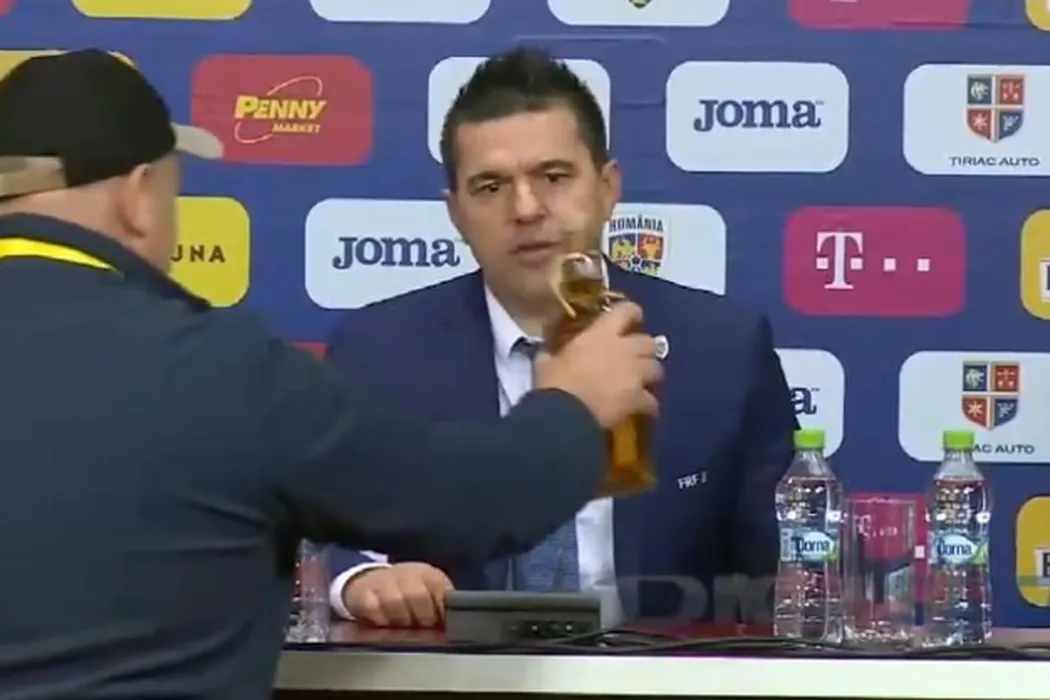 Moment „altfel” la conferința de presă: Contra a fost așteptat cu o sticlă de palincă. Reacția selecționerului :)