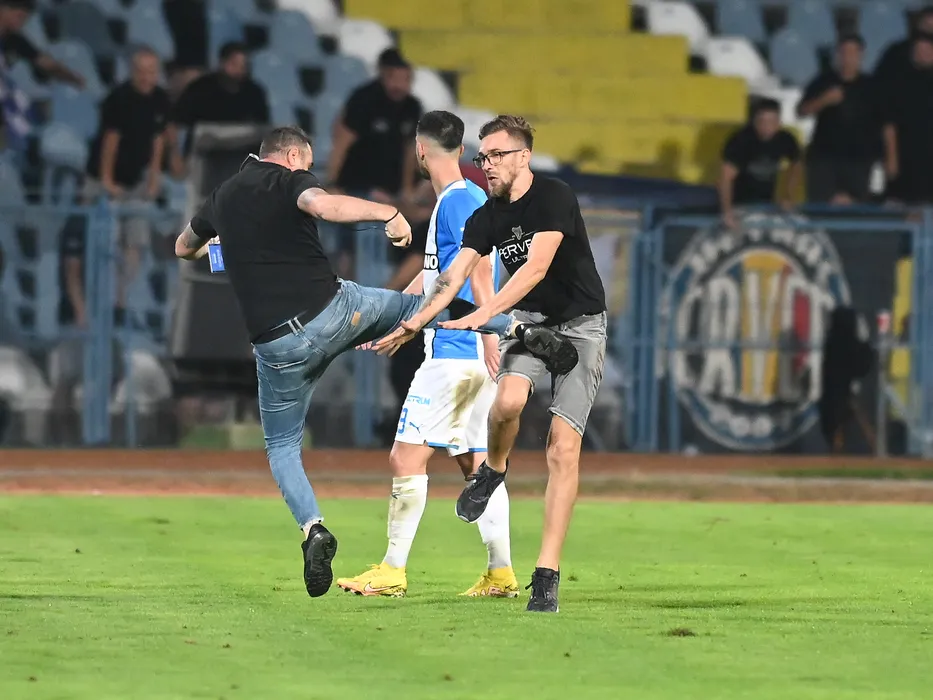 Un stewart il loveste pe un suporter constantean intrat pe teren la meciul de fotbal dintre Universitatea Craiova si Farul Constanta, contand pentru Superliga Superbet, desfasurat pe Stadionul Municipal din Drobeta Turnu Severin, luni 5 septembrie 2022. © FOTO:Razvan Pasarica/SPORT PICTURES