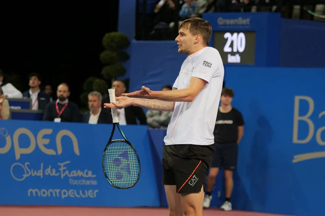 Alexander Bublik (KAZ) in action against Grégoire Barrère (FRA) during the Open Sud de France 2023, ATP 250 tennis tournament on February 8, 2023 at Sud de France Arena in Pérols near Montpellier, France - Photo Patrick Cannaux / DPPI,Image: 754982400, License: Rights-managed, Restrictions: Hungary Out, Model Release: no