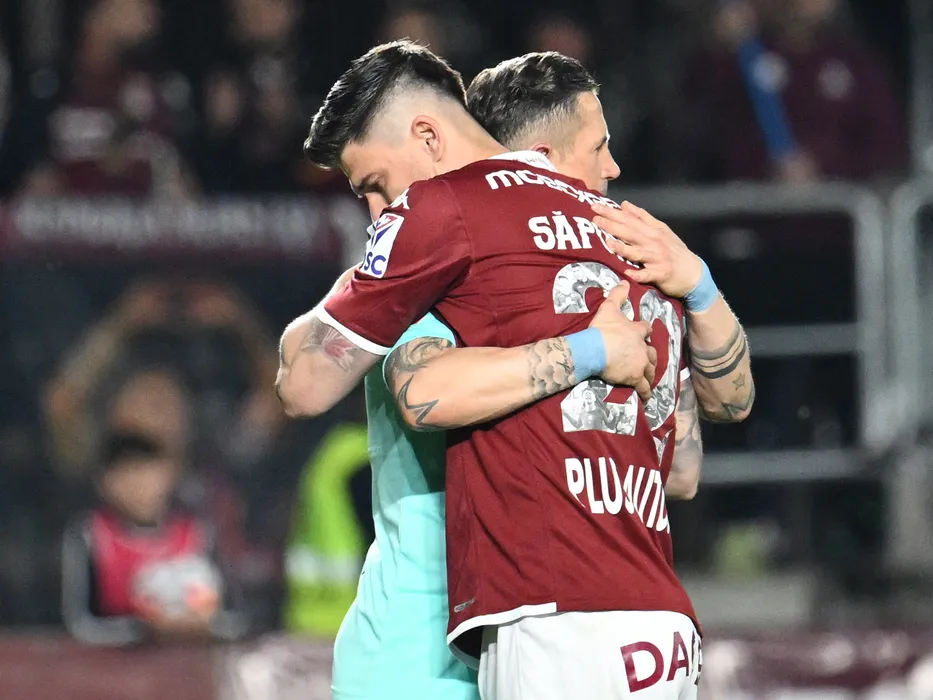 Cristian Ionuț Săpunaru felicitat de catre Ciprian Ioan Deac la iesirea ultima data de pe teren la meciul de fotbal dintre Rapid Bucuresti si CFR Cluj, din cadrul Play off-ului Superligii Superbet, desfasurat pe Superbet Arena Giulesti din Bucuresti, luni 19 mai 2025. © FOTO:Razvan Pasarica/SPORT PICTURES