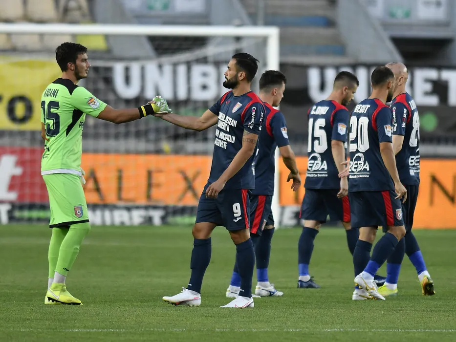 Marian Mihai Aioani si Valmir Berisha se incurajeaza la meciul de fotbal dintre Chindia Targoviste si CS Mioveni, contand pentru mansa tur a barajului pentru promovare in Liga 1 Casa Pariurilor, desfasurat fara spectatori pe Stadionul Ilie Oana din Ploiesti, duminica 9 august 2020. © FOTO:Razvan Pasarica/SPORT PICTURES