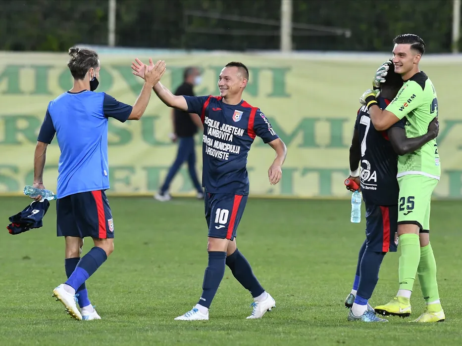 Bucurie tergovisteana cu Liviu Ionut Mihai si Marian Mihai Aioani in meciul de fotbal dintre CS Mioveni si Chindia Targoviste, contand pentru mansa retur a barajului pentru promovare in Liga 1 Casa Pariurilor, desfasurat fara spectatori pe Stadionul Orasenesc din Mioveni, miercuri 12 august 2020. © FOTO:Razvan Pasarica/SPORT PICTURES
